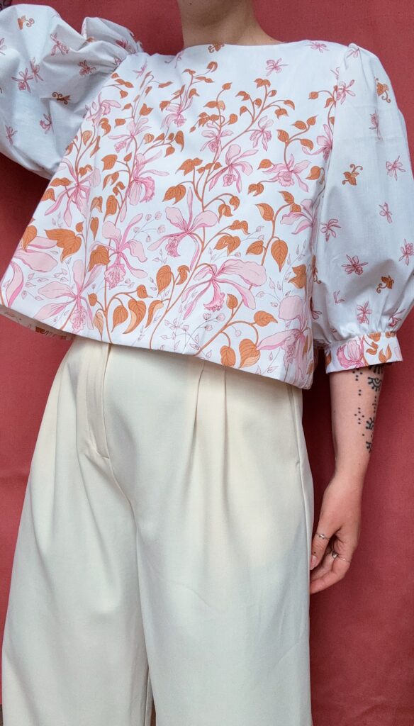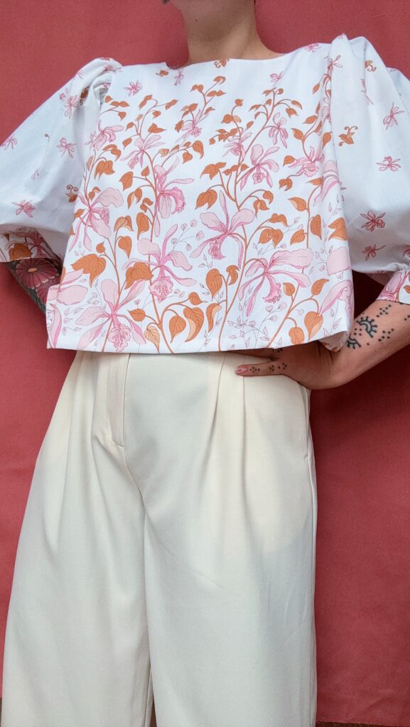 La blouse ballon présente une coupe oversize crop top, idéale à associer avec un bas taille haute. Elle s’enfile par la tête et ne possède pas de fermeture dans le dos. Les manches ballon sont volumineuses, et leur volume varie selon l’épaisseur du tissu ♡