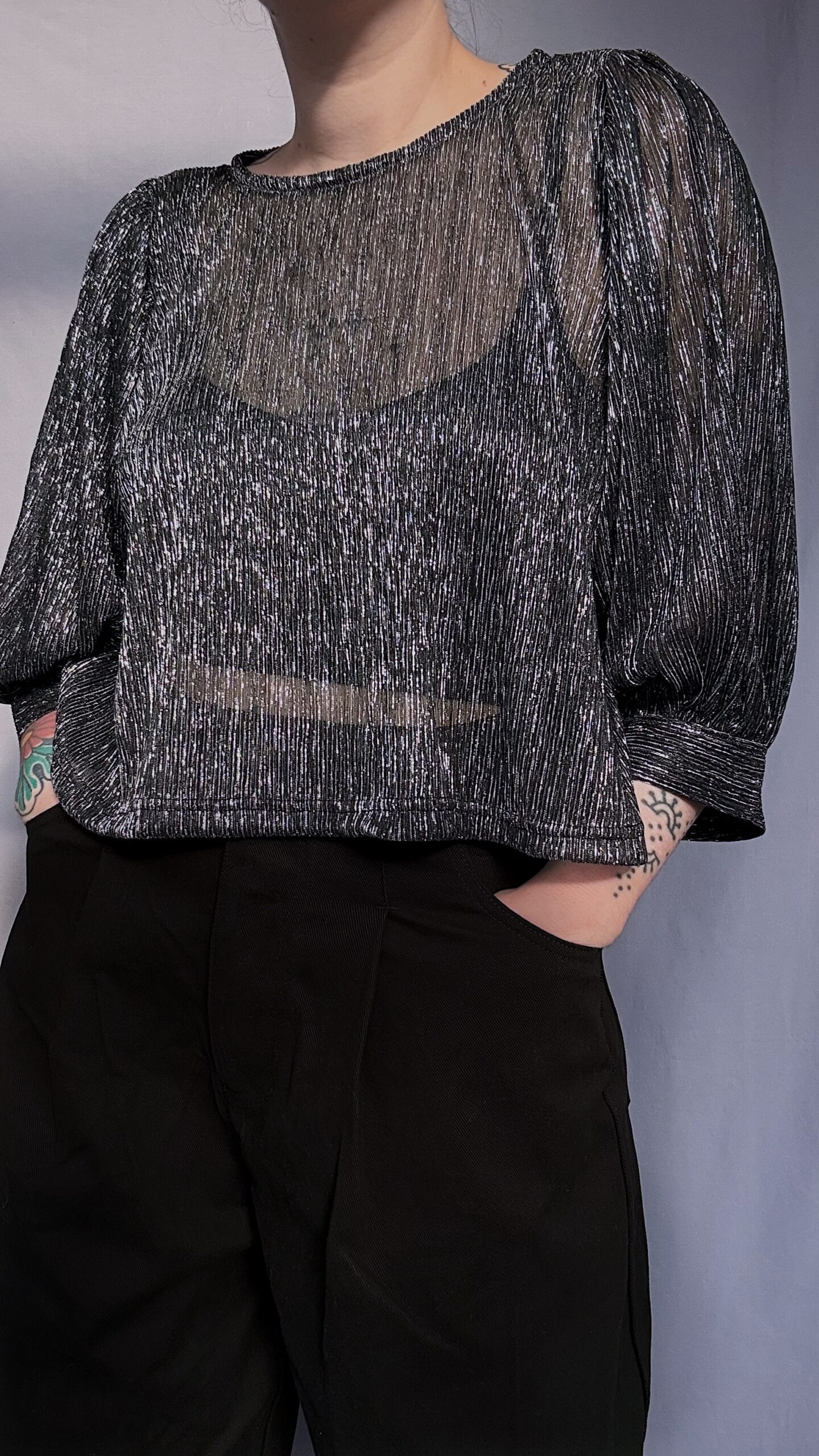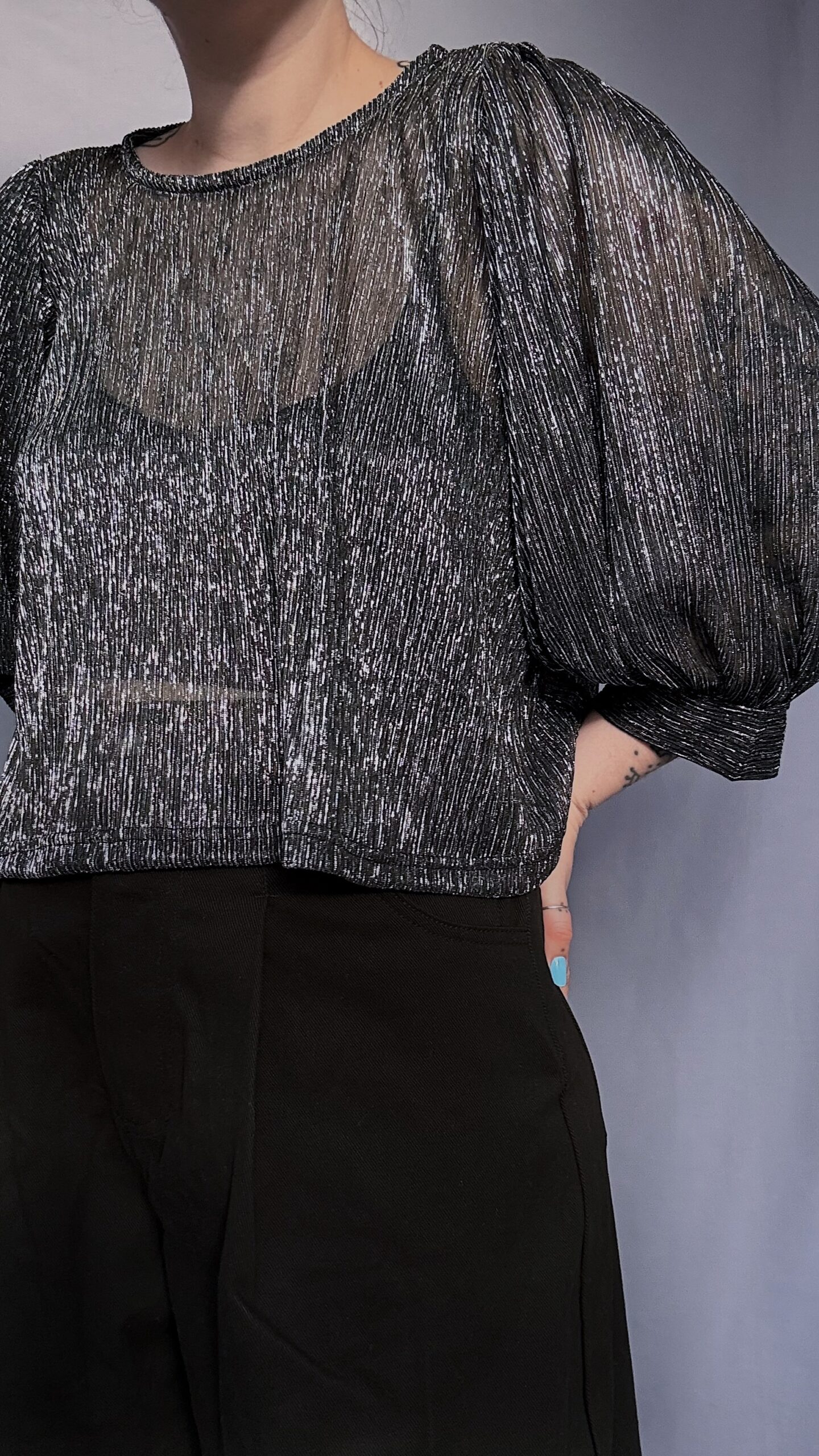 La blouse ballon présente une coupe oversize crop top, idéale à associer avec un bas taille haute. Elle s’enfile par la tête et ne possède pas de fermeture dans le dos. Les manches ballon sont volumineuses, et leur volume varie selon l’épaisseur du tissu ♡
