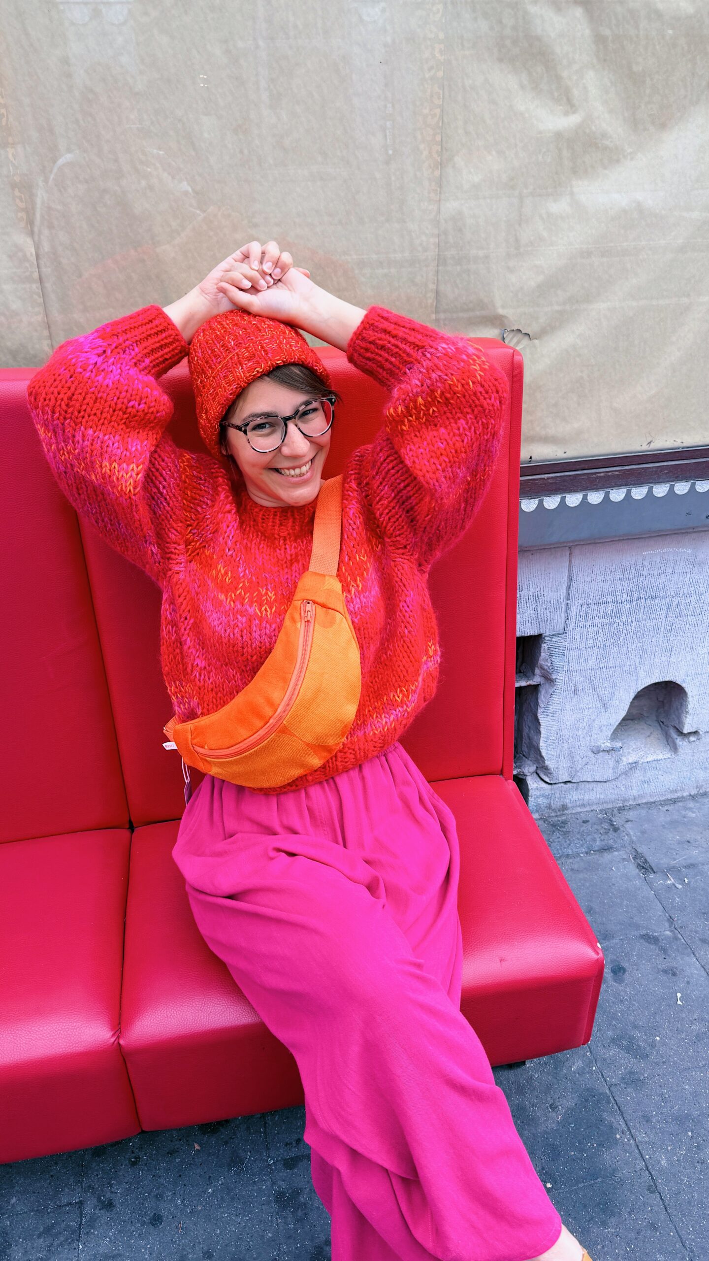 La maille confectionné par ma maman, Anne, en Belgique, à Louvain-la-Neuve, à travers son projet fingersinthewool. Elle retravaille des laines de récupération, après avoir rassemblé suffisamment de pelotes dans les couleurs qui l’inspirent. Ces pièces uniques prennent forme pour des looks toujours plus colorés ! Étant fabriqué à partir de laine de récupération, il est très souvent impossible de retracer précisément la composition d’origine des fils utilisés.