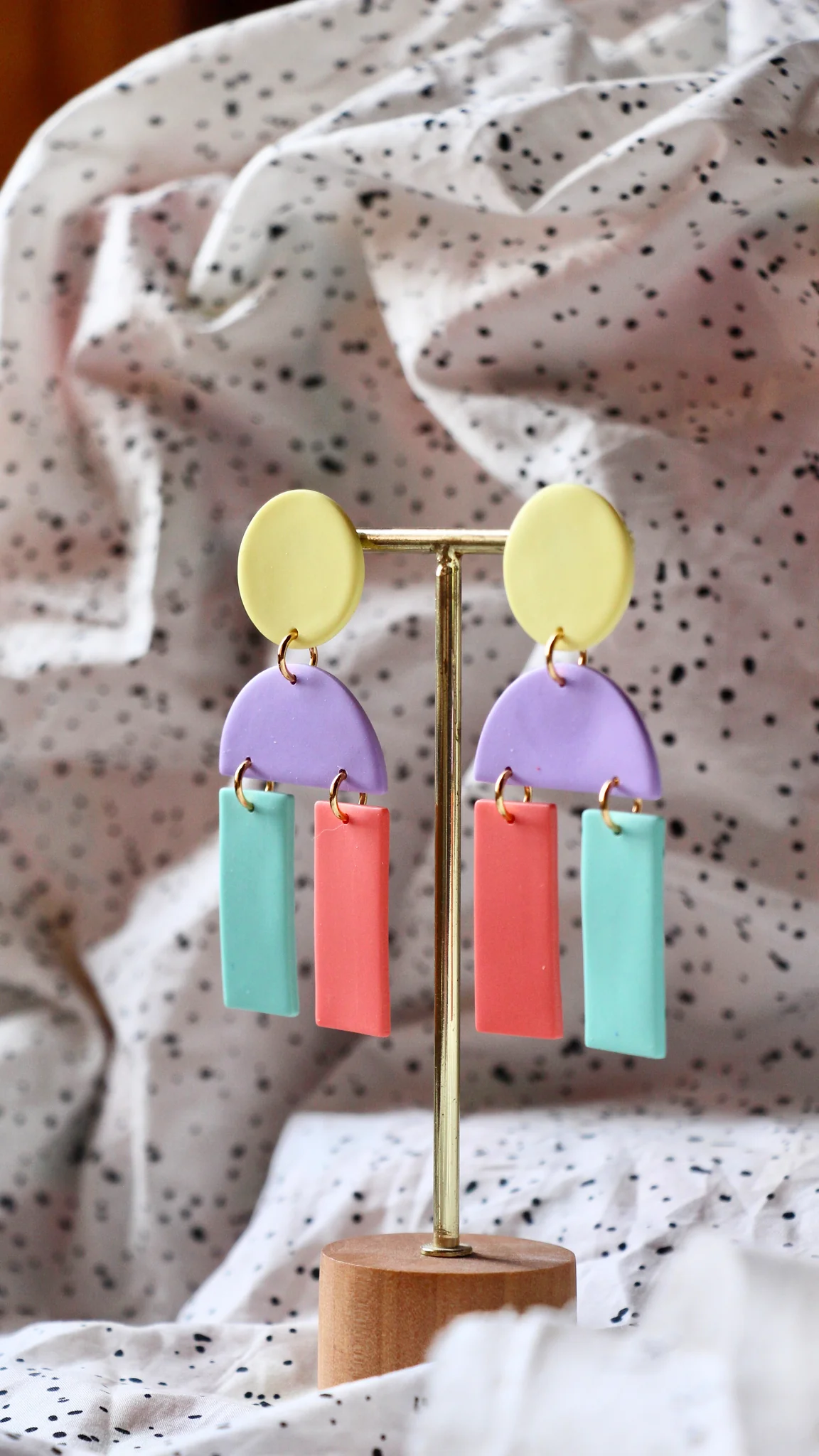 Composition : Pièces en argile polymère et résine. Puce d’oreille en acier inoxydable doré, anneaux de raccord en plaqué or 14 carats.