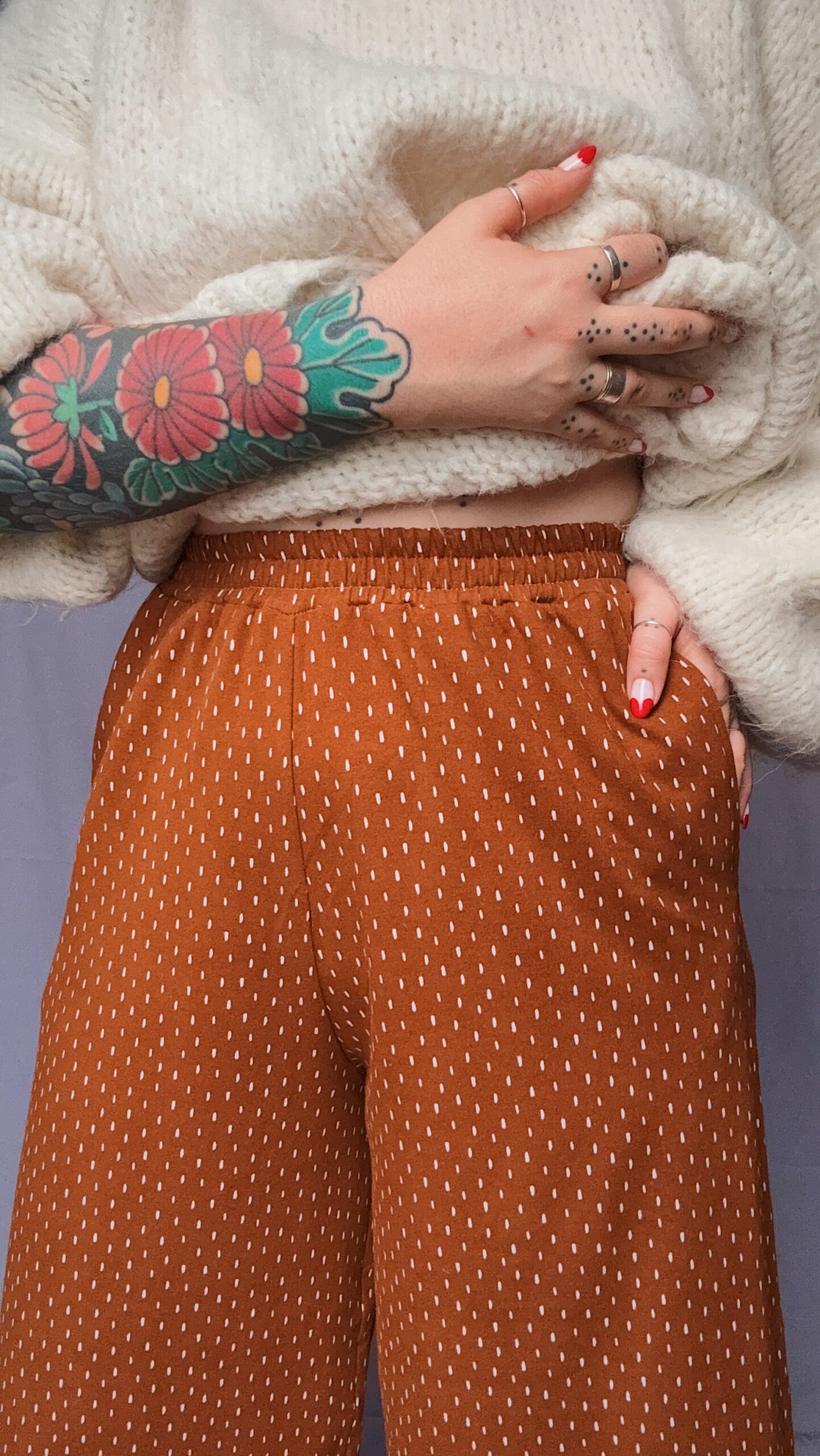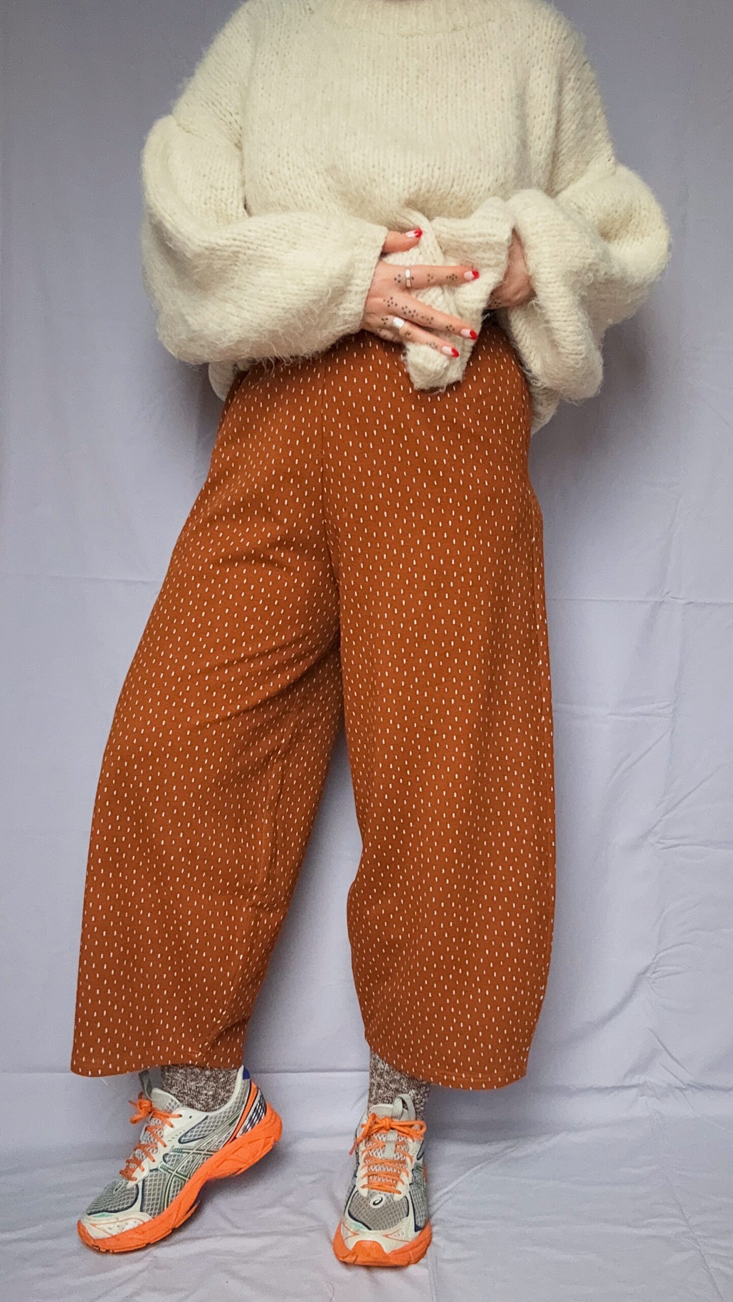 Les pantalons sont réalisés à partir de deadstock et/ou de tissus de seconde main, ce qui leur confère un caractère unique ! Cela ne me permet pas toujours d’en connaître la composition exacte.