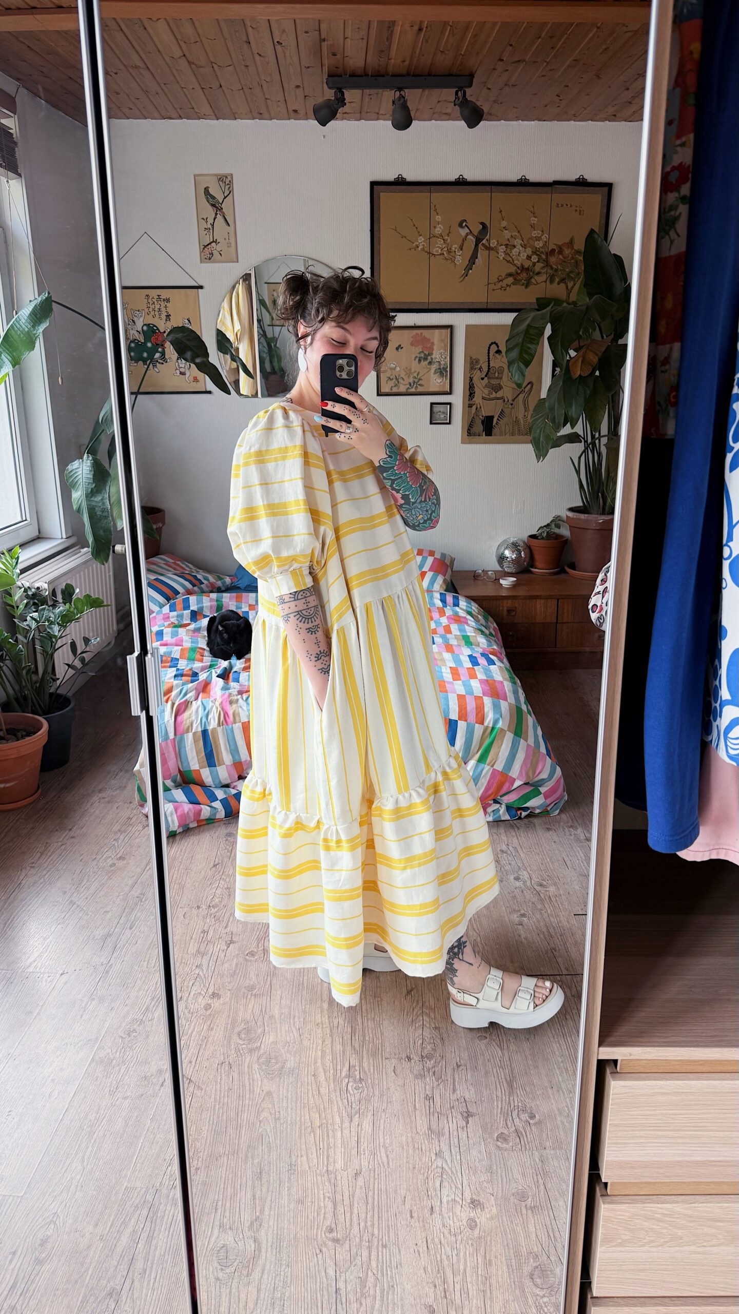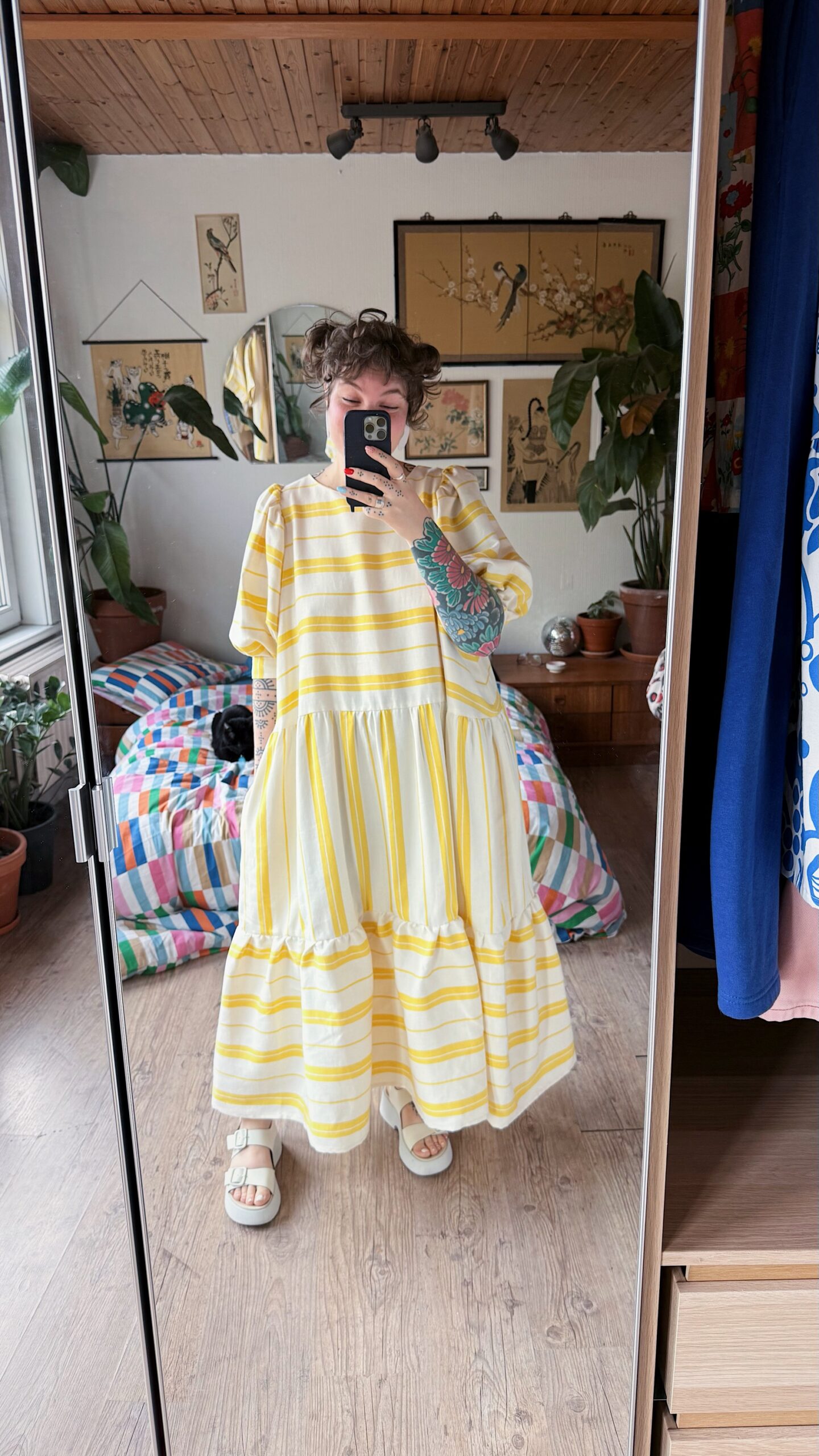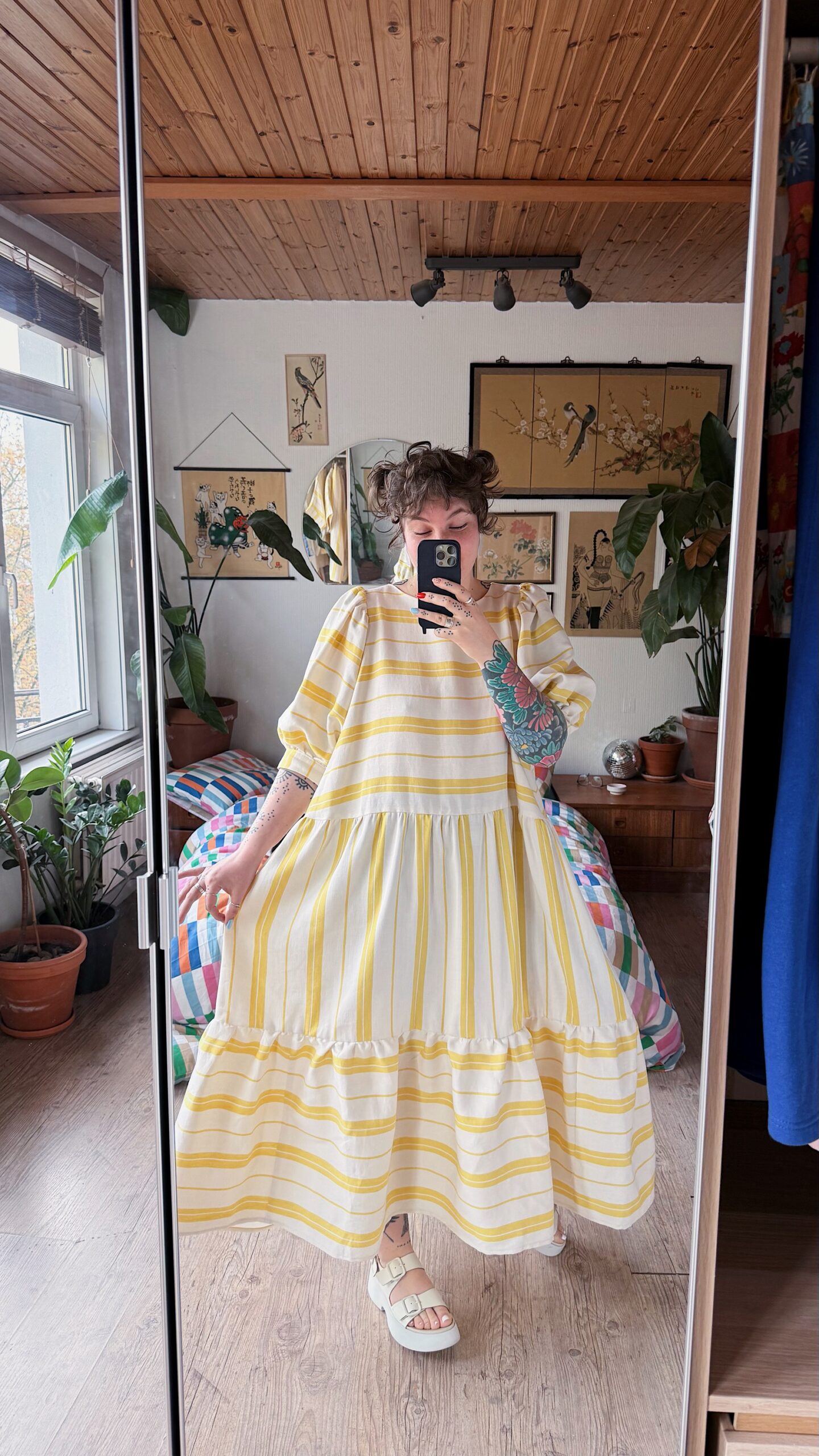 La robe Ballon présente une coupe oversize pour un effet ample. Elle s’enfile par la tête, sans fermeture au dos, et est doublée sur le haut du corps pour plus de confort. Ses manches ballon apportent du volume, variable selon l’épaisseur du tissu ♡