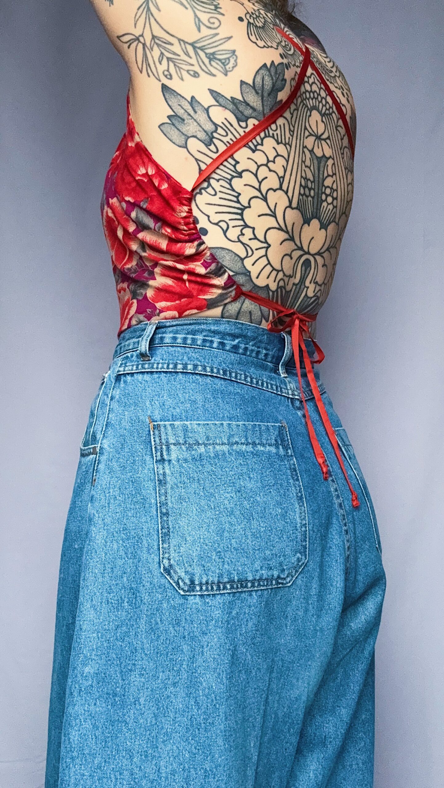 Le top dos nu est réalisé à partir des chutes de blouses et chemises Retro Reset, offrant une seconde vie à chaque morceau de tissu. Sa coupe minimaliste, pensée pour limiter la consommation de matière, le rend idéal pour les petites poitrines et explique qu’il ne convienne pas à toutes les morphologies. Il se noue dans le dos pour un ajustement personnalisé et élégant ♡