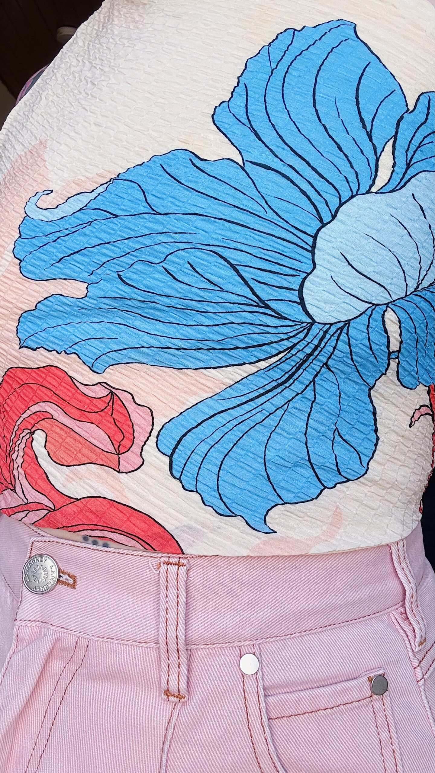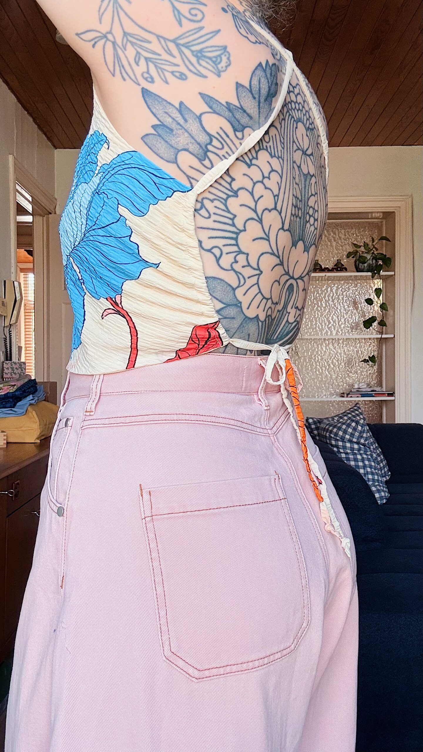 Les tops dos nu peuvent être réversibles : un côté en tissu principal, l’autre en tissu de doublure (également de seconde main), lorsque la quantité de tissu principal est limitée.