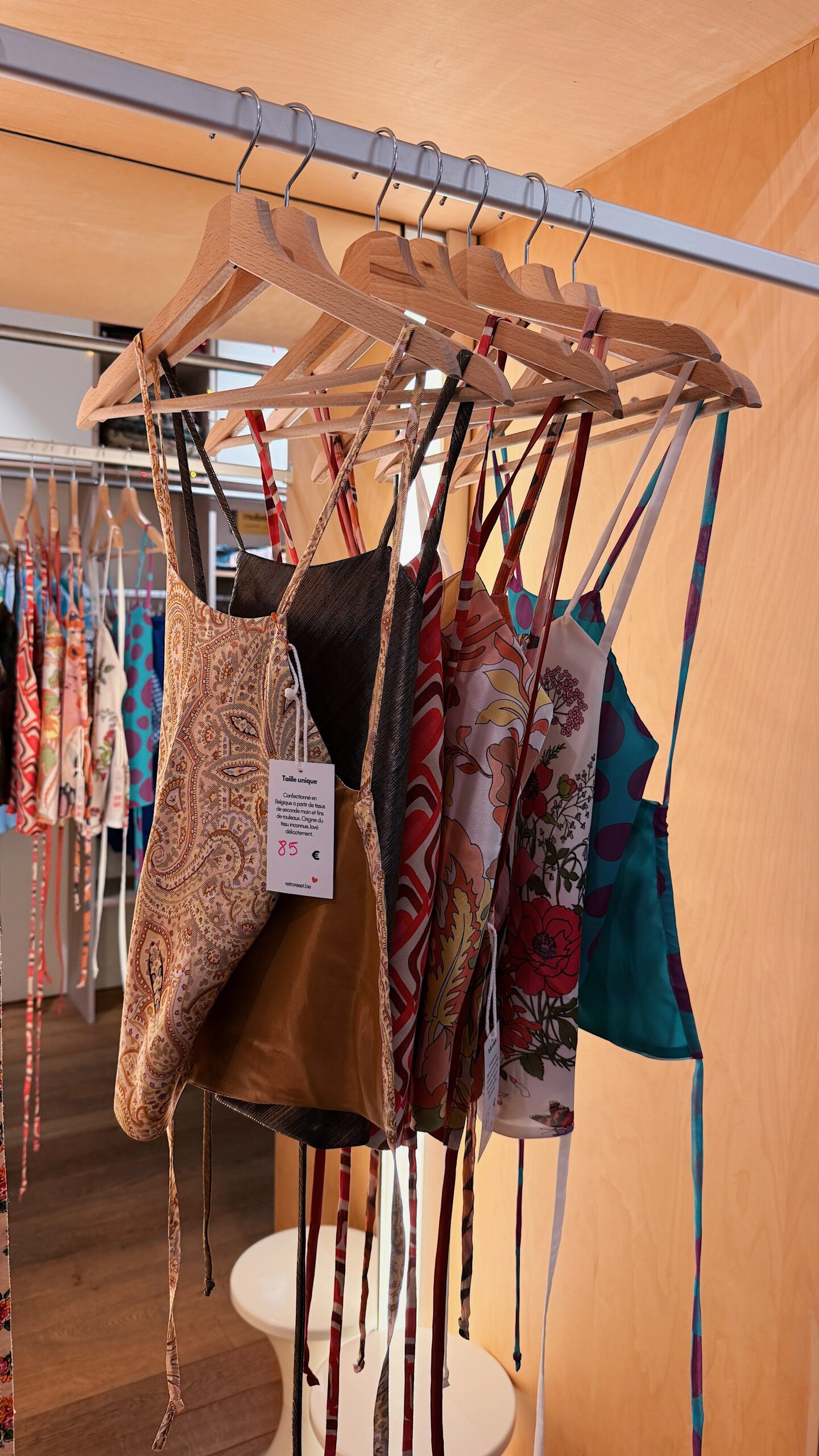 Les tops dos nu sont confectionnés à partir de chutes de blouses et de chemises Retro Reset, elles-mêmes réalisées à partir de tissus de seconde main et/ou de deadstock, ce qui leur confère un caractère unique !