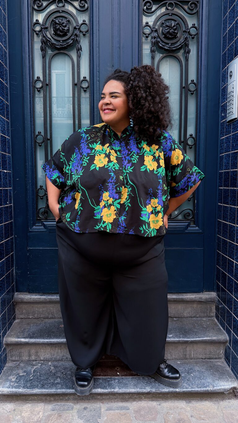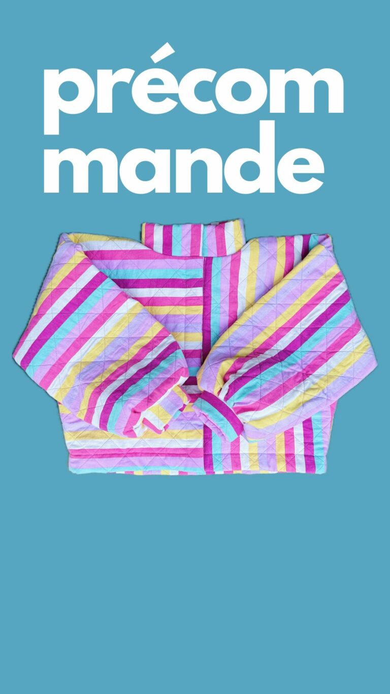 Tu peux choisir la taille et la longueur de ta veste. Je produis le plus souvent la taille 2, longueur 1 (voir tableau des tailles). Si tu préfères une autre taille et que le tissu le permet, fais-le moi savoir avant que la production soit lancée, en me contactant via le formulaire de contact ou sur Instagram.