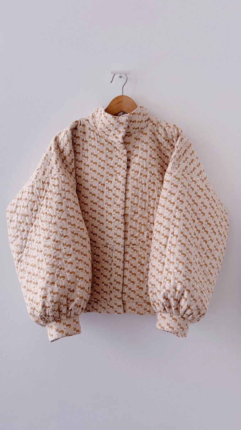 Tu peux choisir la taille et la longueur de ta veste. Je produis le plus souvent la taille 2, longueur 1 (voir tableau des tailles). Si tu préfères une autre taille et que le tissu le permet, fais-le moi savoir avant que la production soit lancée, en me contactant via le formulaire de contact ou sur Instagram.